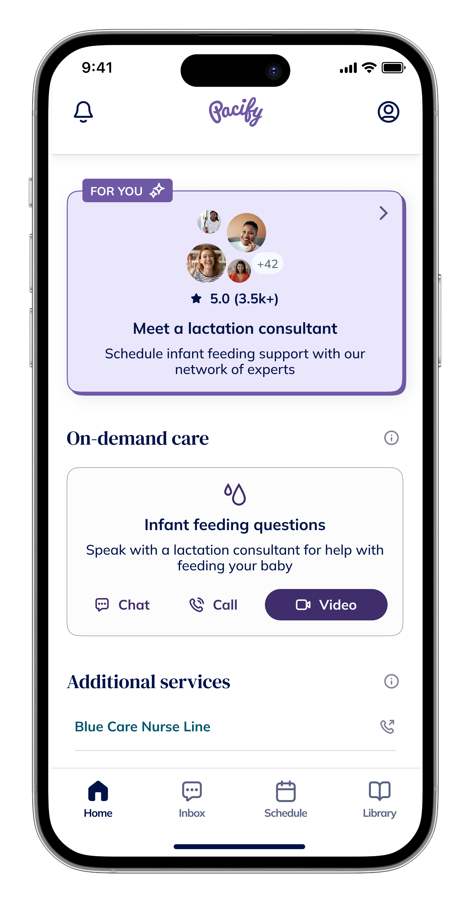 Access expert support directly from your phone with the Pacify app. Whether you need help with labor, infant feeding, or adjusting to life with your newborn, get trusted advice anytime, anywhere.