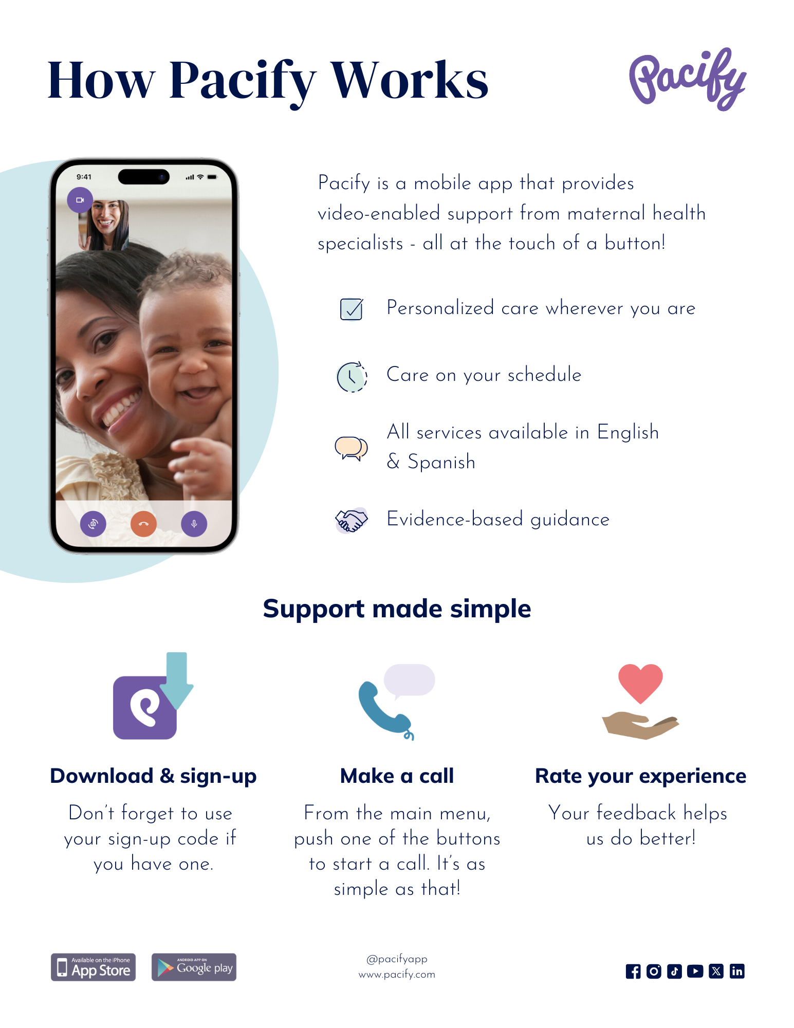 Pacify is a mobile app that provides support from lactation consultants (IBCLCs), doulas, nurses or health plan resources - all at the touch of a button!
